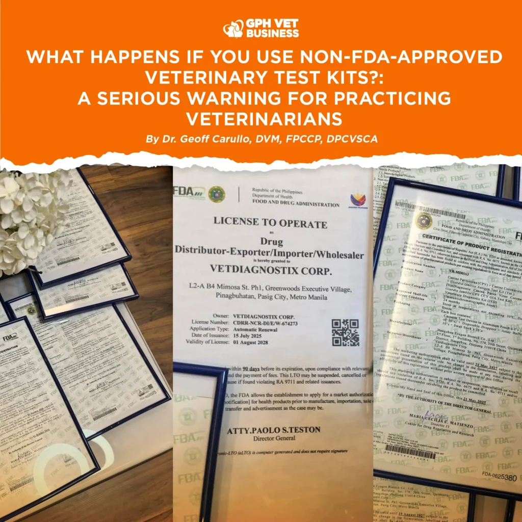 WHAT HAPPENS IF YOU USE NON-FDA-APPROVED VETERINARY TEST KITS? A Serious Warning for Practicing Veterinarians By Dr. Geoff Carullo, DVM, FPCCP, DPCVSCA This is not exaggeration. This is not fear-mongering....