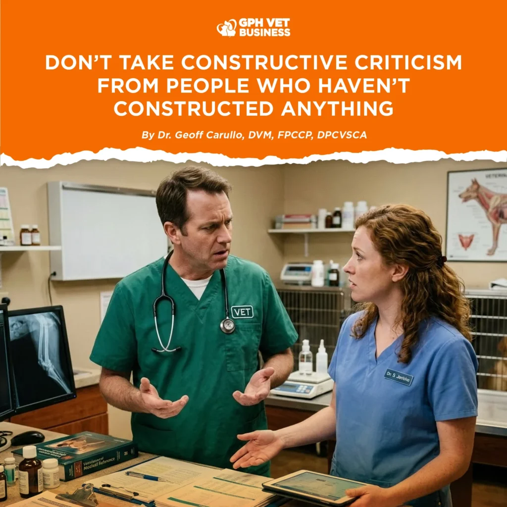 Don’t Take Constructive Criticism from People Who Haven’t Constructed Anything By Dr. Geoff Carullo, DVM, FPCCP, DPCVSCA One quiet reality in veterinary practice is this: the more visible you become,...