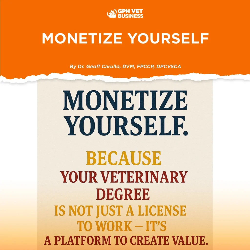 Monetize Yourself By Dr. Geoff Carullo, DVM, FPCCP, DPCVSCA Let’s stop pretending. Being a veterinarian is fulfilling — but fulfillment does not pay the bills. You can love animals deeply...